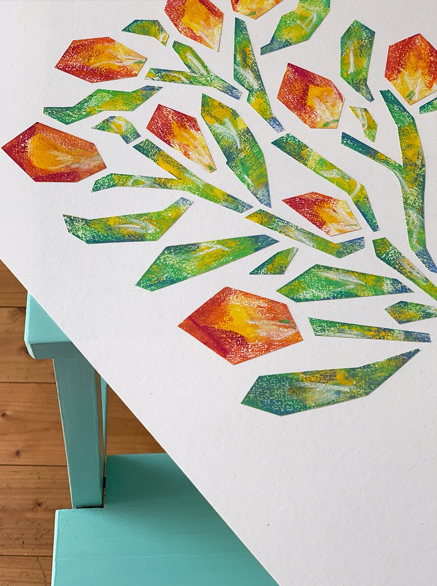 feine Kreidezeichnung mit Künstlerkreiden, geklebte Collage (Original). „Floral rot“, 300 g Naturpapier (Hahnemühle Brittanica, cold pressed), ohne Rahmen.