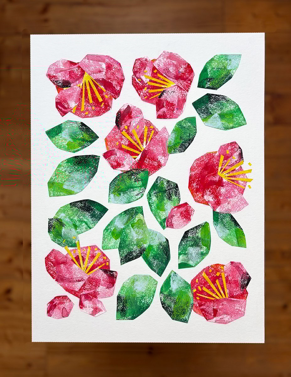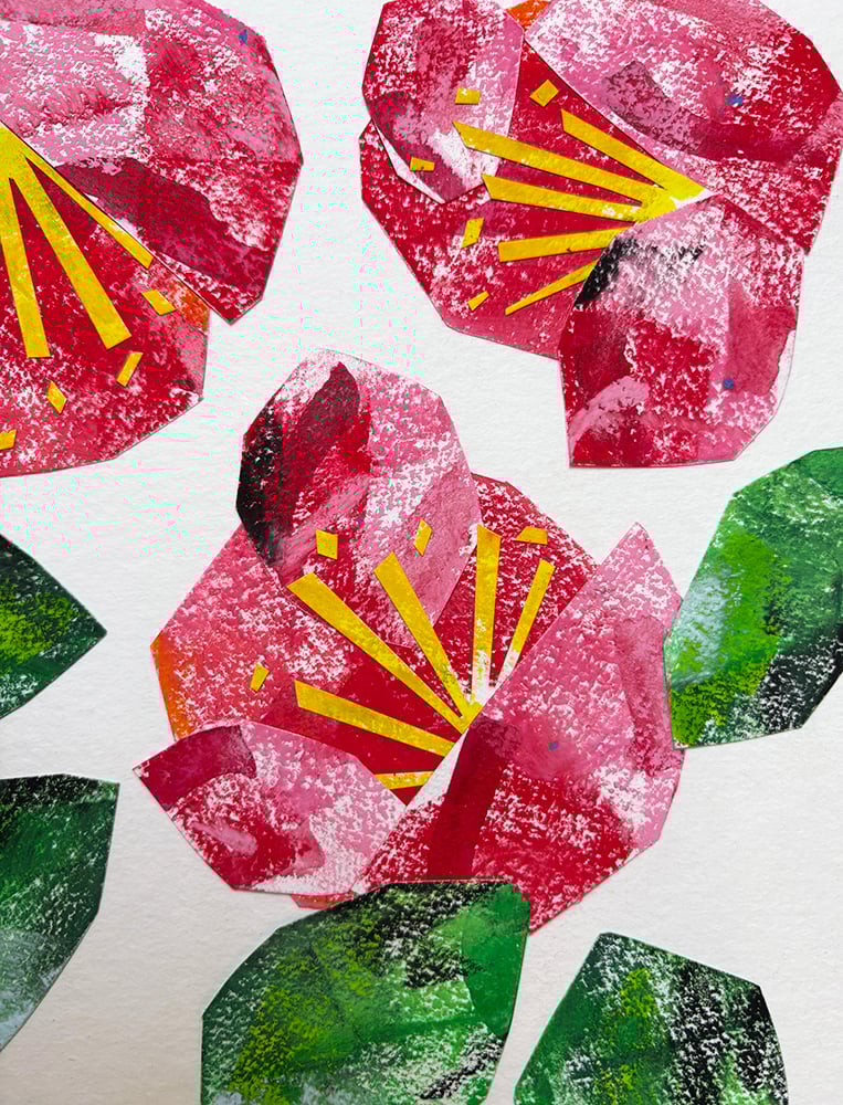 feine Kreidezeichnung mit Künstlerkreiden, geklebte Collage (Original). „Red Camellias“, 300 g Naturpapier (Hahnemühle Brittanica, cold pressed), ohne Rahmen.